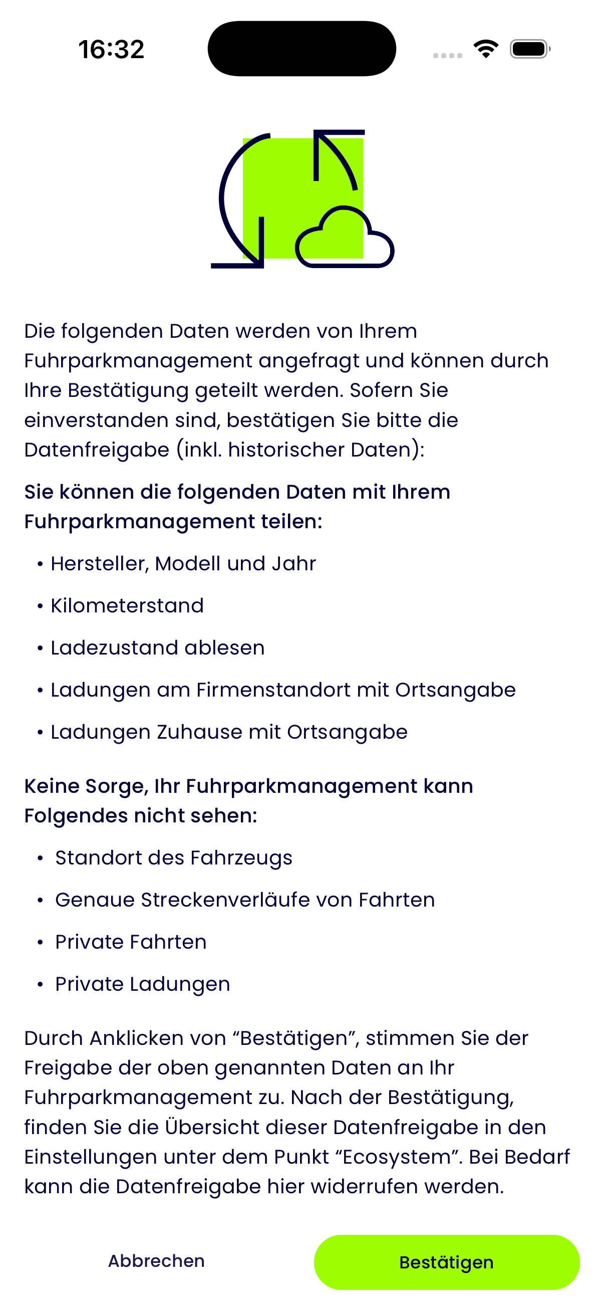 Die TRONITY Anwendung zeigt Ihnen viele Daten zur Nutzung Ihres Flottenfahrzeugs. Insbesondere Standort, Fahrten, Ladungen,...Diese Daten sind zunächst nur für Sie als Benutzer bestimmt. Dennoch gibt es die Möglichkeit, dedizierte Daten mit dem Flotten Management zu teilen - sofern es Sinn macht. Dieser Dialog weißt Sie darauf hin, welche Daten freigegeben werden.