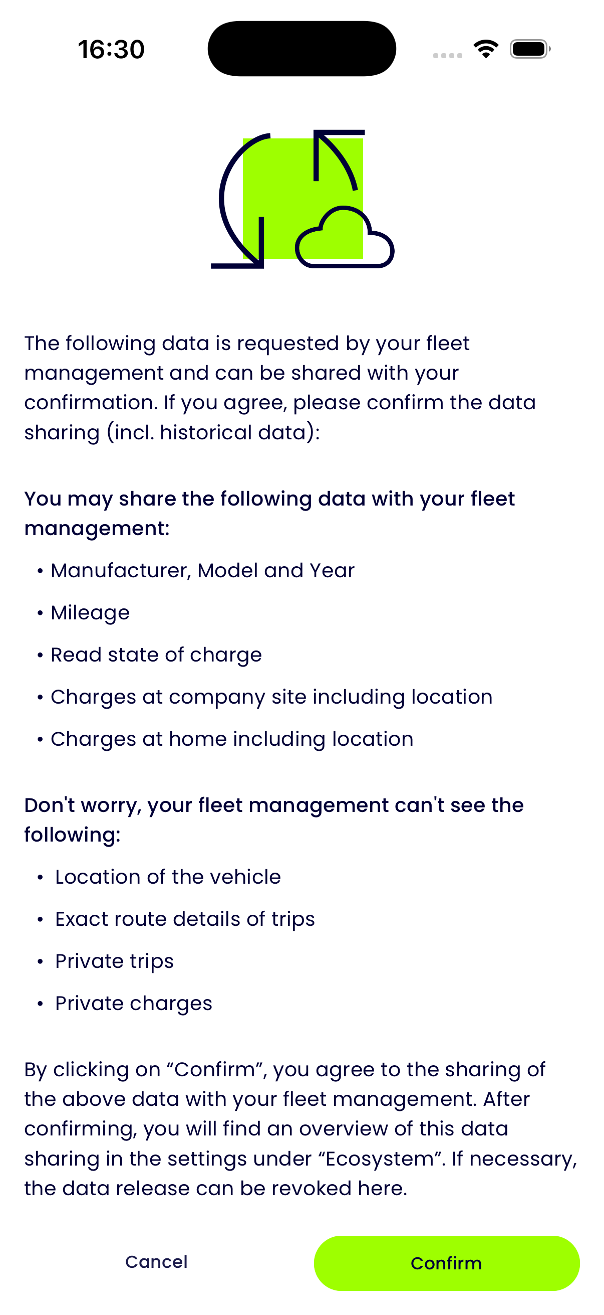 The TRONITY application shows you a lot of data on the use of your fleet vehicle. In particular, location, journeys, loads, ... This data is initially only intended for you as the user. However, there is the option to share dedicated data with the fleet management - if it makes sense. This dialog informs you which data is shared.